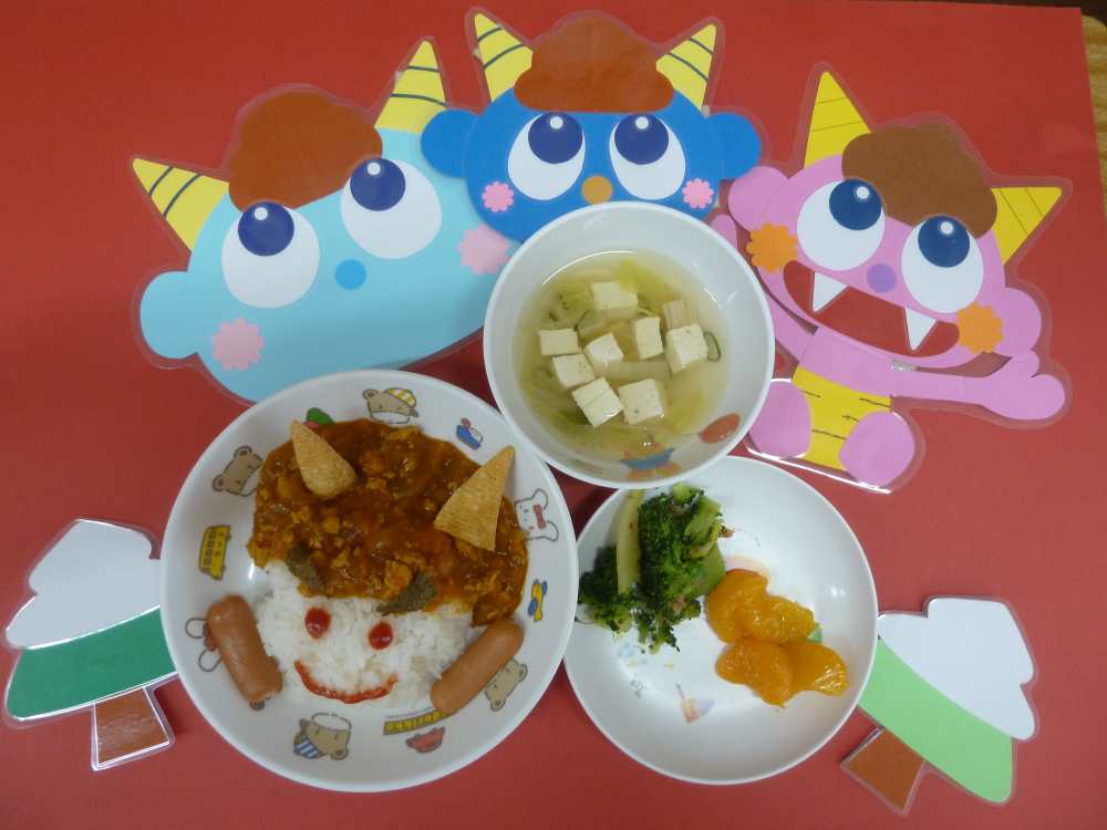 本日のメニューは節分ドライカレー ブロッコリーのおかかあえ すまし汁 みかん(缶)