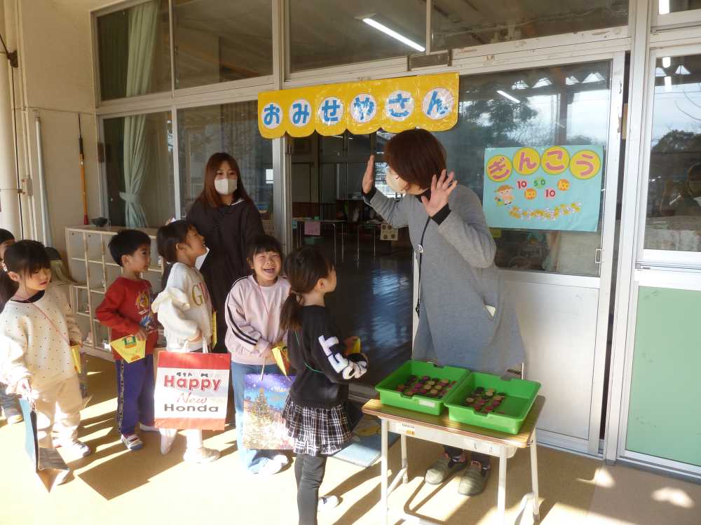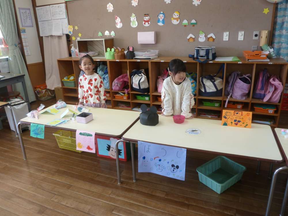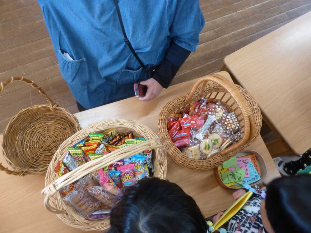 ほし組さんが売り子さんをしてくれています。「いらっしゃい いらっしゃい!おいしいおやつはいかがですか?」