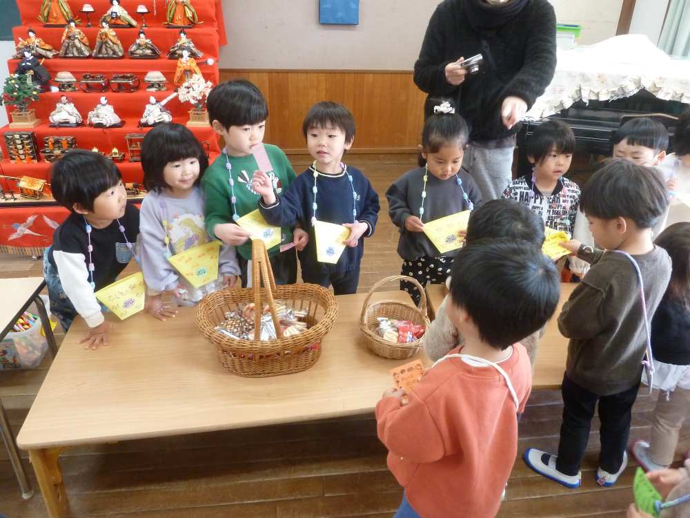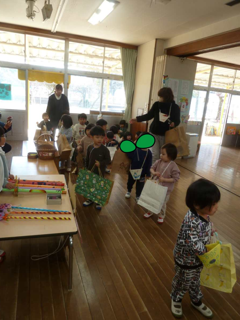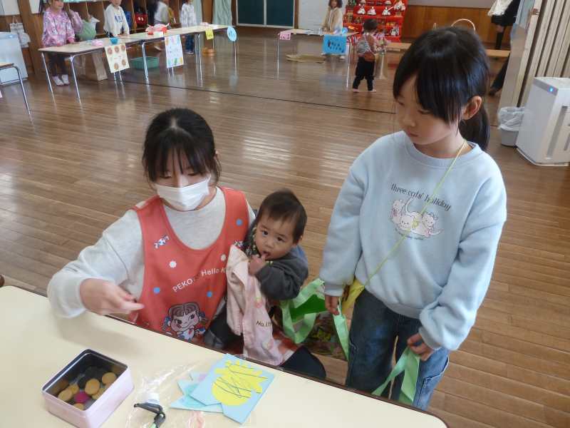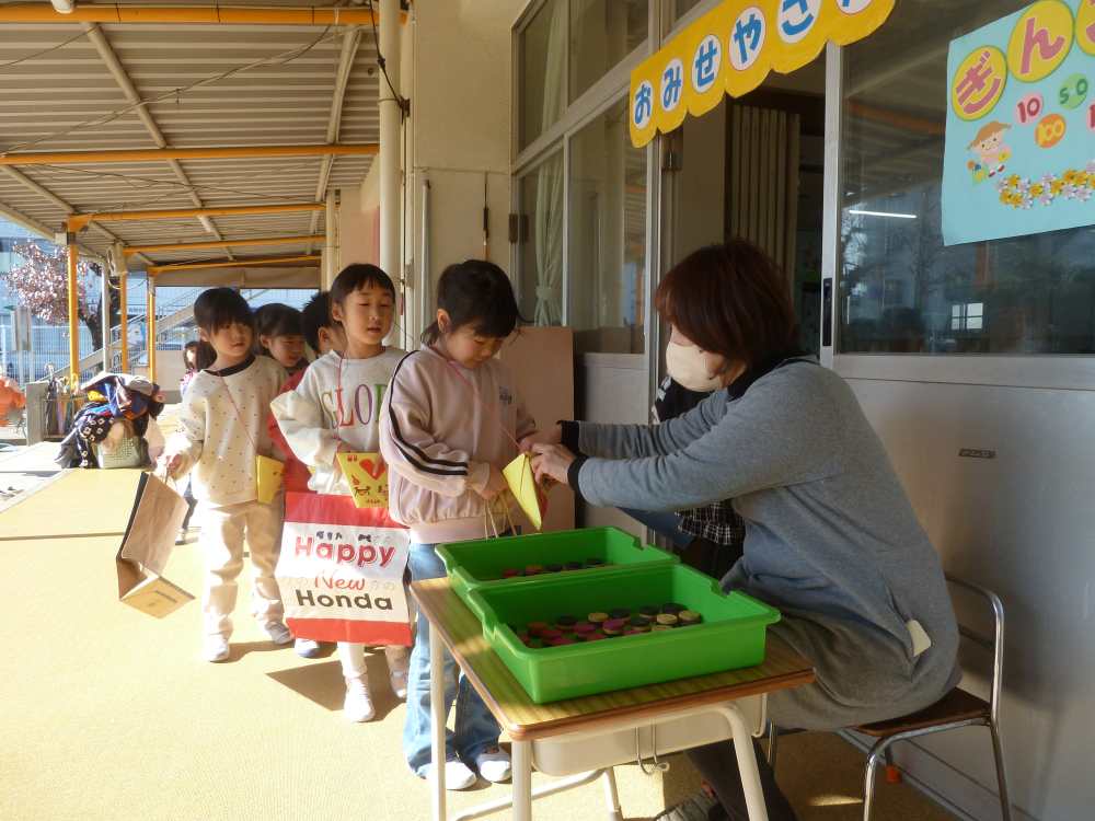 2月18日(水)にお店屋さんごっこがありました。各クラスでお店屋さんで売るものを頑張って作りました。ドーナツ おもちゃ マラカス スティックなどたくさんの品物があります。どれを買おうか?みんな楽しみにしています。 スタートは園長先生による銀行屋さんのオープンです。